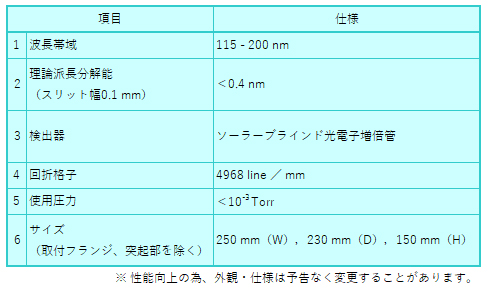 ※ 小型真空紫外分光器、波長帯域:115~170mm、波長分解能:0.8mm