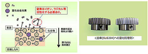 活性化した窒素を金属表面に拡散、もしくは化合物を生成して表面硬化させる技術です。