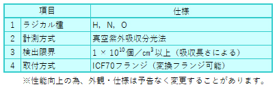 - ラジカルモニターとはプラズマなどに存在する基底順位の原子状ラジカルを吸収 分法により計測する装置です。