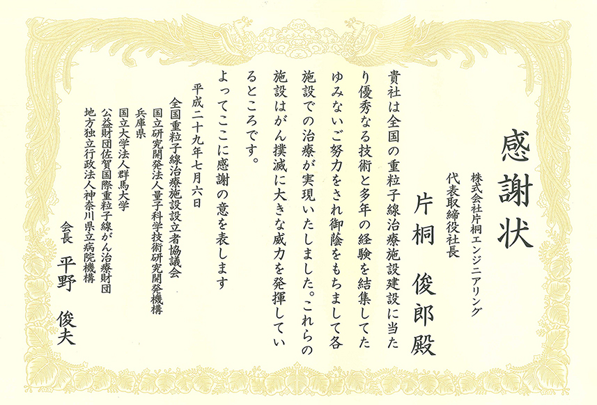 - 全国重粒子線治療施設設立者協議会事務局様より、重粒子線治療施設の建設及び運営において感謝状を頂きました。