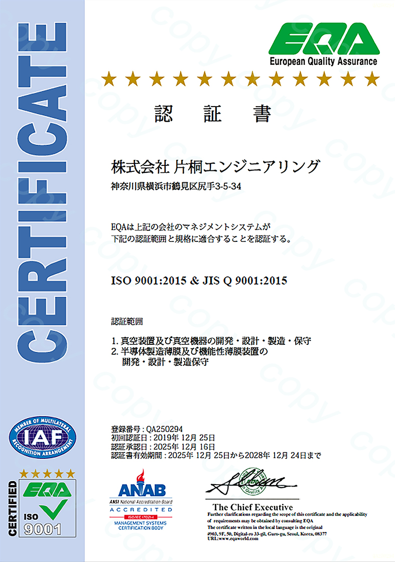 - 弊社、横浜事業所は、2019年12月に ISO 9001:2015(品質マネジメントシステム)を認証取得しました。